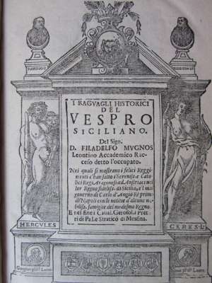 Iragvagli historici del vespro siciliano. [Palermo]: [n.p.] ?1645 .4to., engraved title, ?contemporary calf gilt, some slight spotting to last few pages, slight rubbing to boards and cracking to ends of spine