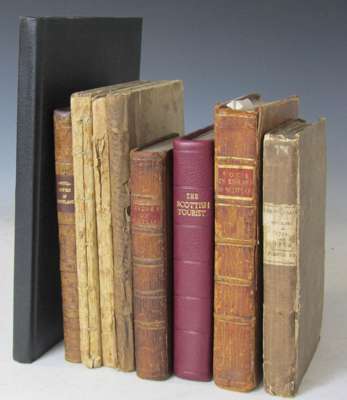 A tour in England and Scotland in 1785. London: G.G.J. and J. Robinson, 1788. 8vo., 6 engraved plates, contemporary calf, some rubbing to boards, cracking to spine and slight spotting to plates; [Gascombe, Professor/an English Officer] The contrast: or Scotland as it was in the year 1745, and Scotland in the year 1819. London: P. Wright & Son, 1825. 8vo., original boards, joints cracking, original paper label rubbed, some foxing to endpapers, bookplate of 'H. Vincent Whitelaw' attached to paste-down endpaper; Belfour, John A new history of Scotland... London: 1770. 12mo., engraved frontispiece, folding map, 7 engraved plates, contemporary calf, [ESTC T101758], slight rubbing and soiling to spine and boards, some marginal dust soiling and spotting, a few closed tears to map; [Anon.] The Scottish tourist, and itinerary... Edinburgh: Stirling & Kenney, 1825. 12mo., engraved frontispiece, 2 folding maps, 5 engraved plates, modern red half morocco, some spotting and offsetting; Cardonnel, Adam de Picturesque antiquities of Scotland. London: Edwards, 1788-1793. Small 4to., 3 volumes, 100 engraved plates with commentaries, original boards, pages untrimmed, some foxing to boards and text (in volume 1), some boards soiled, blue paper peeled away from part of volume 2 and all of volume 3, a few leaves loose, cracking to spine; [Idem] Picturesque antiquities of Scotland. London: Edwards, 1788. Small 4to., parts 1 and 2 together, 24 engraved plates, contemporary half calf, slight fading to spine and rubbing to boards, some spotting; Gregory, I.R. Solitary rambles among the mountains of Scotland in 1853. 4to., manuscript copy of the work, text pages bordered by watercolour thistle motifs, 15 plates, mostly lithographs with some hand-colouring, tissue guards, modern black cloth binding, occasional dust soiling (9)