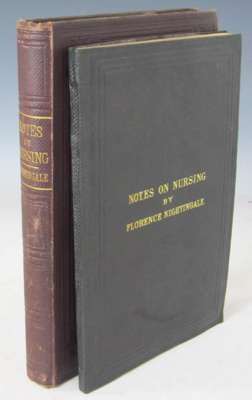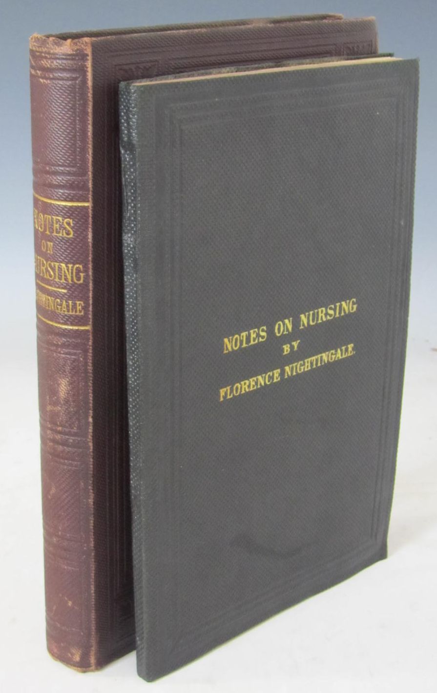 Notes on nursing. London: Harrison, [1860]. First edition, ? second issue, with the words "The right of Translation is reserved" in square brackets on title page, but no advertisements on the endpapers, also with original price of two shillings written in pencil on verso of front free endpaper, 8vo, original black cloth, gilt title on upper cover; Nightingale, Florence Notes on nursing. London: Harrison, 1860. New edition, revised, original brown cloth (2)