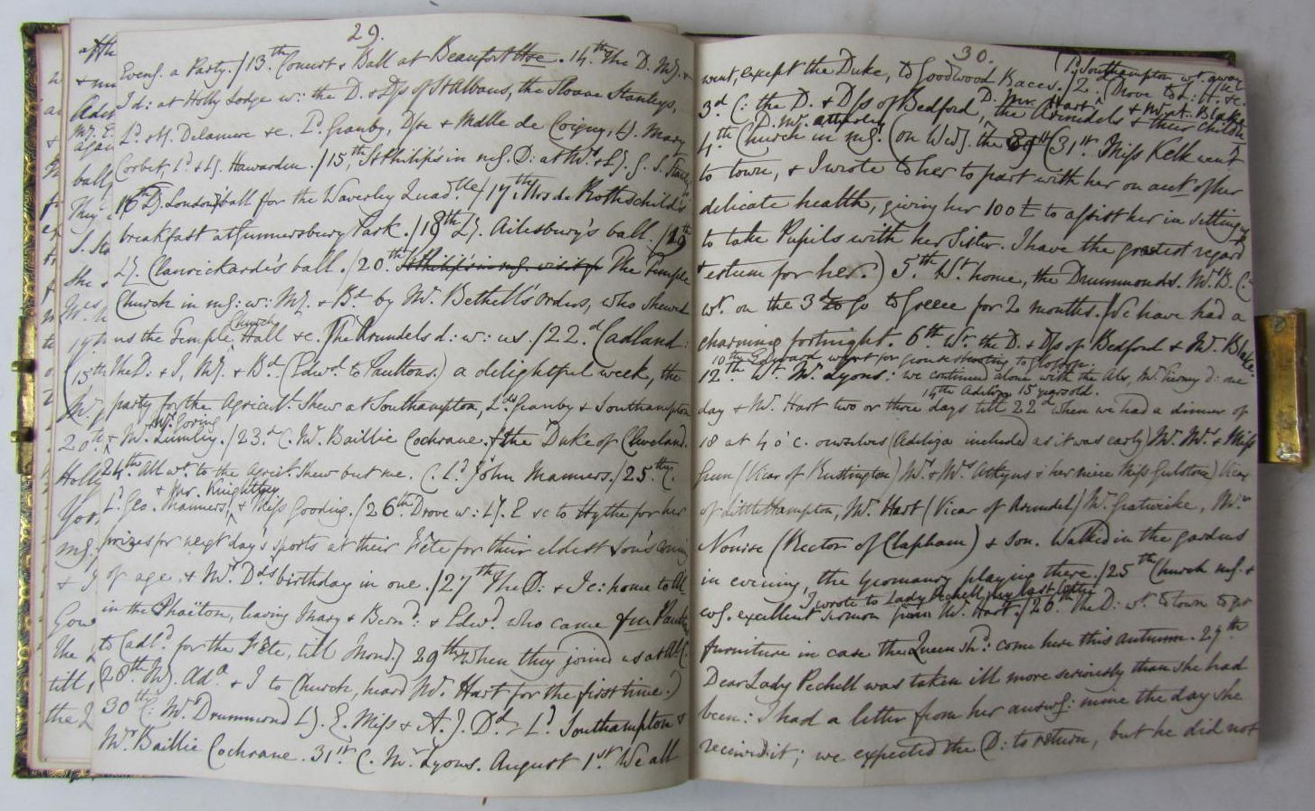 Autograph Journal, 1843 to 1853, describing her life as Lady-in-Waiting to Queen Victoria and at Arundel Castle, and contemporary events including Loius Philippe's visit to England, the singing of Jenny Lind, Queen's Victoria's speech in the new House of Lords, Chartist demonstrations, the growth of the railways and the Duke of Wellington's funeral, lacking the pages covering ther period October 1848 to March 1852, contemporary green morocco stamped in blind, with clasp, 159pp, 4to, loose