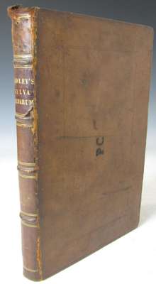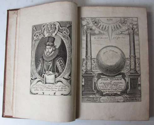 Sylva sylvarum, or a natural history in ten centuries. London: W. Rawley, 1664. 4to., [ESTC R12044] engraved portrait and additional engraved title, contemporary calf with blind tooled decoration and the initials 'PC' embossed in black into covers, a few internal spots but largely very clean, a few slight marginal tears with no loss of text, slight rubbing to covers and spine, minor dampstaining to table