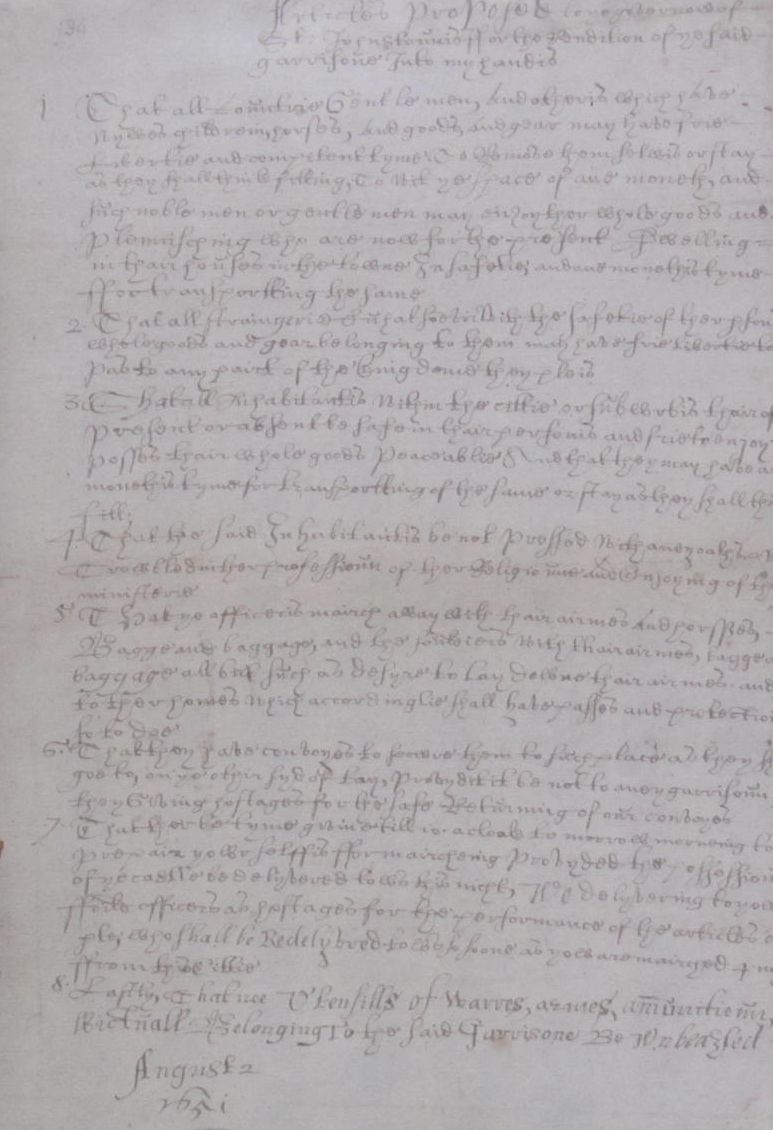 "Articles proposed to the governor of St Johnstounis for the rendition of the said garrisone into my handis", listing 8 articles, dated August 2 1651, manuscript, one leaf, folio, 30.5 x 19.5cm,