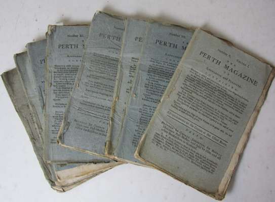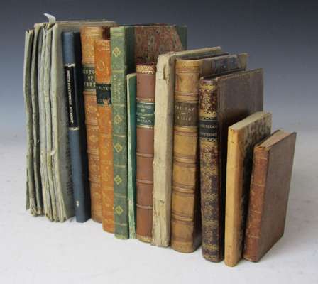 Marshall, Thomas Hay The history of Perth... Perth: John Fisher, 1849. 8vo., engraved frontispiece, contemporary half calf, gilt tooled spine, slight rubbing to spine and covers, light foxing to endpapers; MacEachainn, Eoghan Leanmhuinn Chriost'... Perth: Morisons, 1826. 12mo., contemporary calf, some rubbing and chipping to spine and boards, slight foxing to endpapers; McNayr, James A guide from Glasgow to some of the most remarkable scenes in the Highlands of Scotland... Glasgow: printed in the Courier Office, 1797. 8vo., inscribed to "Mr Drummond of Blairdrummond, with most respectful compliments from the Author", contemporary brown morocco, some rubbing to spine and edges of covers; [Anon.] Morison's Perth and Perthshire Register for 1823... Perth: D. Morison, [1823]. 12mo., contemporary quarter calf, some fading to spine, slight soiling to boards and very light spotting; [Anon.] Guide to the city and county of Perth. [Perth; J. Morison, 1838?]. 8vo., engraved map and title page, 11 other engraved plans and plates, contemporary green half morocco, some rubbing to spine and boards, slight worming to spine; Millar, David The Tay: a poem. Perth: Thomas Richardson and David Wood, 1850. 8vo., contemporary half calf, some rubbing to spine and boards, previous owner's stamp in pink to title page and bookplate attached to paste-down endpaper; "Old Officer" Cautions and advices to officers of the army, particularly subalterns... Perth: R. Morison, 1895. 8vo., original blue wrappers, pages untrimmed, occasional spotting; Morison Miscellanea perthensis. Perth: Morison, 1801. 8vo., engraved frontispiece, contemporary speckled calf with gilt emblem of gardener and words: "Mulcent Aurae Firmat Sol Educat Imber", some cracking to joints and slight darkening to pages; 9 non-consecutive volumes of The Perth Magazine of Knowledge and Pleasure. Perth: R. Morison, 1772-3. 8vo., original blue wrappers, some marginal dust soiling; and 3 others (20)