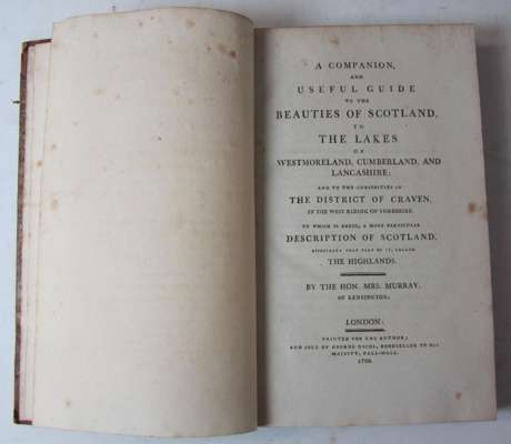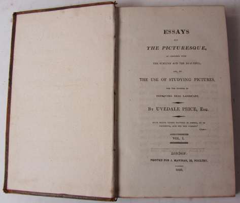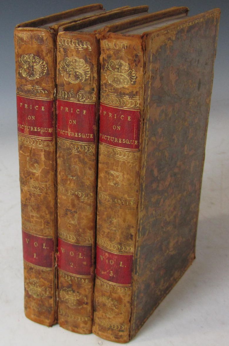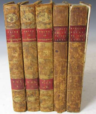 Essays on the picturesque. London: J. Mawman, 1810. 8vo., 3 volumes, contemporary boards, some foxing in volume 1 and occasional very light foxing in volume 3, paper flaw in foremargin of volume 3 with no loss of text; Murray, Mrs [later Aust, S., Hon. Mrs] A companion and useful guide to the beauties of Scotland, to the lakes of Westmoreland, Cumberland and Lancashire... London: printed for the author and sold by George Nicol, 1799. 8vo., 2 volumes, contemporary half calf, some light foxing and occasional darkening to some pages, foxing worse on title and last few pages of volume two, a few pencil annotations, some rubbing to covers and spines, cover of volume 2 detaching (5)