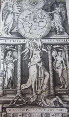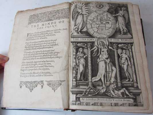 The history of the world. London: 1614. First edition, folio, engraved title, 8 double page maps and plans, includes "Minde of the Front" leaf, contemporary calf gilt, sympathetically rebacked, upper cover detached, lacking 6N6, some minor spotting and slight worming with loss of some letters, occasional dust soiling and a few small marginal tears and paper flaws