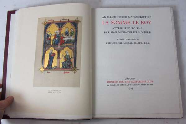 An illuminated manuscript of La Somme le Roy. Attributed to the Parisian miniaturist Honoré. Oxford: Roxburghe Club, 1953. 4to, coloured frontispiece and 34 plates, contemporary quarter morocco, very minor foxing to final plate