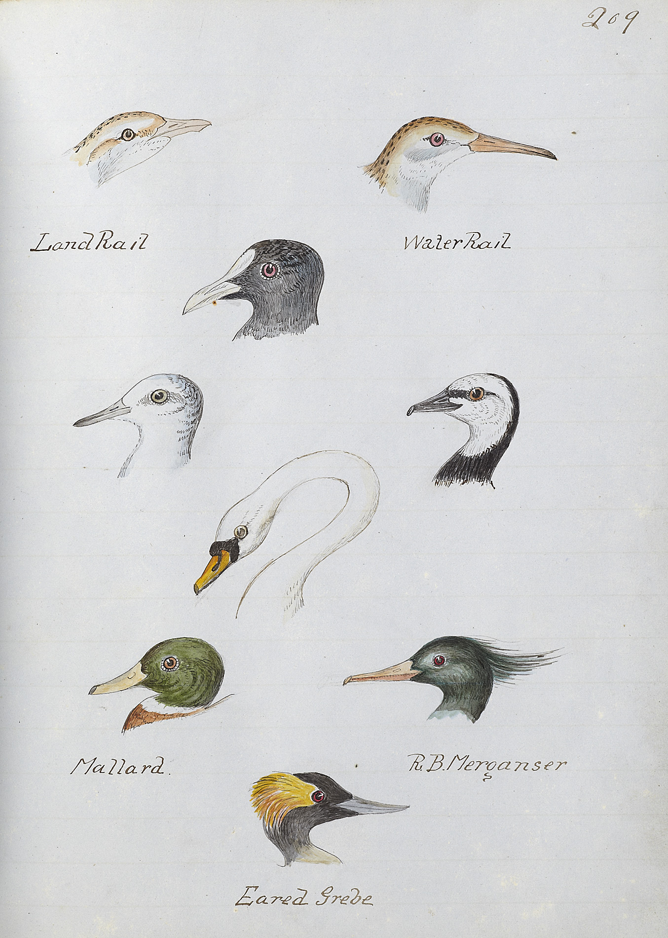 Notebook on ornithology. 20 Apr 1860 - 30 Dec 1865. About 175 leaves, including 11 pages of watercolour sketches of birds' heads, 4to, rebound in brown morocco by Roger Powell with fish design and Earl of Perth's crest on sides, velvet and cloth chemise, slipcase