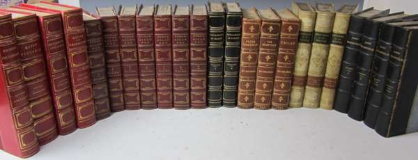 Masefield, John. Poems. New York: Macmillan, 1953. 8vo., 4 volumes, contemporary blue half morocco gilt, some rubbing to joints and edges; Maxwell, Herbert, Sir Memories of the months. London: Edward Arnold, 1901-1903. 8vo., 3 volumes, plates, contemporary vellum with gilt tooled foliate border decoration, some marginal spotting and soiling to covers; Du Maurier, George The Martian. London: Harper & Brothers, 1898; Trilby. London: Osgood, McIlvaine & Co., 1895; Peter Ibbetson. London: James R. Osgood, McIlvaine & Co., 1896. 8vo., plates, contemporary green morocco gilt, blue cloth gilt spines and covers attached to endpapers and preserved, spines faded, joints cracking, occasional spotting; Poe, Edgar Allan Complete works. London: G.P. Putnam's Sons, 1902. 8vo., 10 volumes, contemporary red morocco, spines gilt, t.e.g., some darkening to edges of covers and pages, some joints cracked with a few covers detaching; Wharton, Grace and Philip The wits and beaux of society. Philadelphia: Porter & Coates, [1860?] 8vo., 2 volumes, plates, later blue half morocco gilt, some slight rubbing to covers; Strachey, Lytton Queen Victoria. New York: Harcourt, Brace and Co., 1921.; Eminent Victorians. New York: G.P. Putnam's Sons, 1918; Elizabeth and Essex... New York: Harcourt, Brace and Co., [1928]; Books and Characters... New York: Harcourt, Brace and Co., 1922.; 8vo., red half morocco, spines gilt, slight soiling to spines and rubbing to some spines and corners (23)