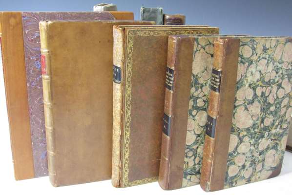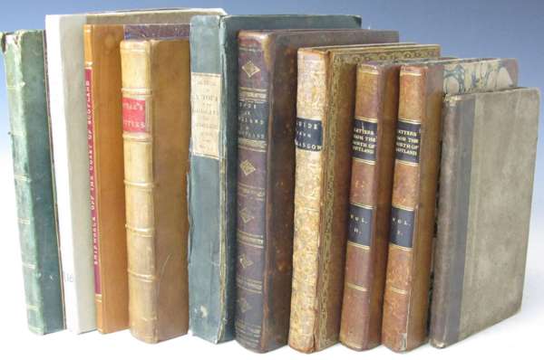 Letters from Edinburgh, written in the years 1774 and 1775. London: J. Dodsley, 1776. First edition, 8vo., contemporary calf, red morocco label; M'Nayr, James A guide from Glasgow to some of the most remarkable scenes in the Highlands of Scotland. Glasgow: Courier Office, 1797. 8vo., contemporary mottled calf gilt, joints splitting; [Thomson, William] A tour in England and Scotland, in 1785. London: G.G.J. & J. Robinson, 1788. 8vo., 6 engraved plates, contemporary mottled calf, neatly rebacked retaining spine; [Burt, Edward] Letters from a gentleman in the North of Scotland to his friend in London. London: Gale &c., 1815. 2 volumes, 8vo., contemporary half calf, spines gilt, foot of one spine rubbed; [? Larkin] Sketch of a tour in the highlands of Scotland. London: Baldwin &c., 1819. 8vo., cloth, lacks map, some dampstaining, very worn; Duncan, A. & J. Duncan's itinerary of Scotland. Glasgow, 1816. Tall 8vo, folding map, green half morocco, map torn without loss, head of spine worn; [Spencer, Frederick Charles] Journal of a tour to Scotland. Oxford: Munday and Slatter, 1816. First edition, 8vo., list of subscribers, original boards, uncut, rebacked, upper hinge weak; [Anon.] North of England and Scotland in MDCCIV. Edinburgh: W. Blackwood, 1818. 12mo, edited from a MS by Thomas Johnes of Hafod, 1 of 100 copies printed, original boards, uncut, rebacked with cloth, rubbed; Queensberry, Charles Douglas, Duke of Information for His Grace the Duke of Queensberry and Dover, and Mr Alexander McKenzie. [Edinburgh, 1729]. 4to., half calf, some dampstaining, especially to title (10)