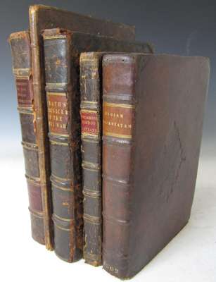 Regiam majestatem: The auld lawes and constitutions of Scotland. Edinburgh: Thomas Finlayson, 1609. Folio, 2 parts in 1 volume, woodcut initials and ornaments, contemporary calf , armorial stamp to boards, worn at edges, some dampstaining and marginal worming with occasional loss of a couple of letters, corner tear to title page, slight rubbing to boards; Drummond, William The history of Scotland from the year 1423 until the year 1542. London: Richard Tomlins, 1655. 4to., 5 engraved portraits and engraved portrait frontispiece, later panelled calf gilt, [Wing: D 2196] some rubbing to spine and covers, spotting and darkening to pages; Heath, James A chronicle of the late intestine war in the three kingdoms of England, Scotland and Ireland. London: Thomas Basset, 1676. Second edition, 4to, title printed in red and black, engraved frontispiece laid down, contemporary calf with 'PC' stamped onto covers, [Wing H1321], some rubbing to covers and slight cracking to joints; [Cromarty, George Mackenzie, Earl of] The laws and acts made in the first parliament of... James VII [first and session sessions only] Edinburgh: printed by the heir of Andrew Anderson, 1685. Folio, contemporary speckled calf, [Wing: 1252], some rubbing to spine and boards; Burnet, Gilbert The memoirs of the lives and actions of James and William, dukes of Hamilton and Castlehead... London: R. Royston, 1677. First edition, 4to., 2 laid down engraved portraits, contemporary calf with spine rebacked, [Wing: B 5832], slight cracking to joints and rubbing to boards (5)