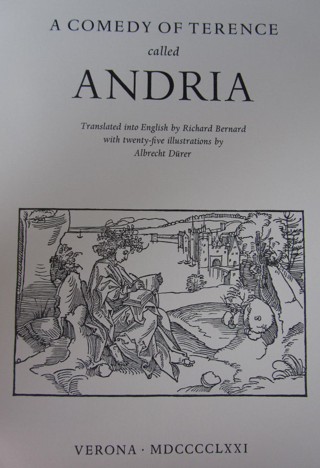 A comedy of Terence called Andria. Verona: Bodoni, 1971. Folio, 25 woodcut illustrations by Dürer, number 17 of 160 copies, contemporary quarter vellum gilt, t.e.g., others uncut, green cloth slipcase