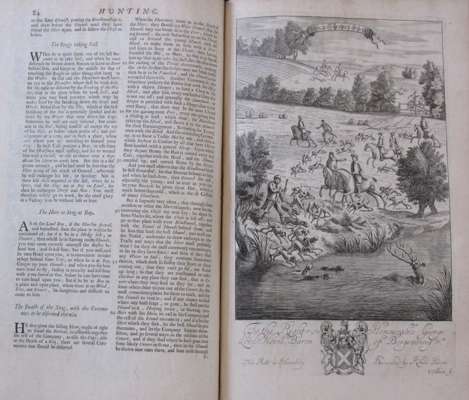 The gentlemans recreation. London: S. Roycroft for Richard Blome, 1686. Folio, 2 parts in one volume, engraved frontispiece and 85 plates including 10 plates of subscribers' arms, woodcuts in the text, title printed in red and black, license leaf before title, neatly rebacked retaining old marbled boards, corners neatly repaired, [Wing B3213], Viscount Mersey, Bignor Park - J. Hamilton Leigh - Viscount Strathallan copy with bookplates, a good copy