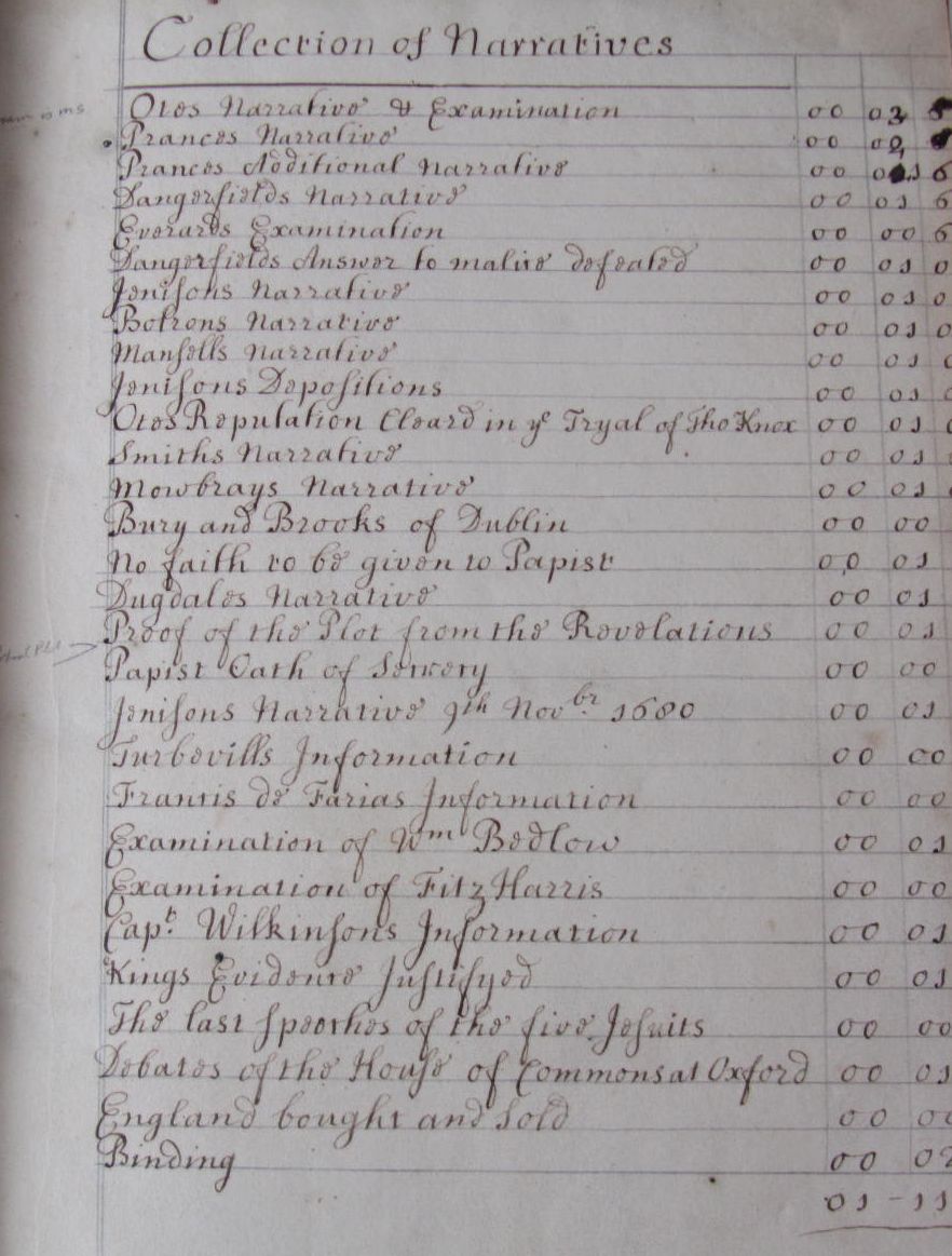 Titus Oates (1649-1705 )-- A true narrative of the horrid plot and conspiracy of the Popish party. London: T. Parkhurst & T. Cockerill, 1679; Prance, Miles A true narrative and discovery of several very remarkable passages relating to the horrid Popish plot. London: D. Newman, 1679; Prance, Miles The additional narrative of Mr. Miles Prance. London: F. Smith &c., 1679; Dangerfields, Thomas Mr. Tho. Dangerfields particular narrative. London: H. Hills, &c., 1679; Everard, Edmund The depositions and examinations of Mr Edmund Everard. London: D. Newman, 1679; The King's Evidence justif'd: or Doctor Oates's vindication of himself. London: Jonathan Edwin, 1679, title soiled, some spotting, [Wing O46]; The Reputation of Dr. Oates... clear'd in the Tryal of Thomas Knox... and John Lane. London: Robert Harford, 1679, first edition, uncut, [Wing R1117]; The Debates in the House of Commons assembled at Oxford the Twenty First of March, 1680, [London: R. Baldwin, 1681], corner of first two leaves torn with some loss, some spotting, [Wing E2546], folio; bound with 20 other related tracts (the first lacking a plate, another imperfect; and a 6 leaf copy manuscript headed "Master Oates his Examination by the House of Commons" by John Clement, contemporary panelled calf, neatly rebacked