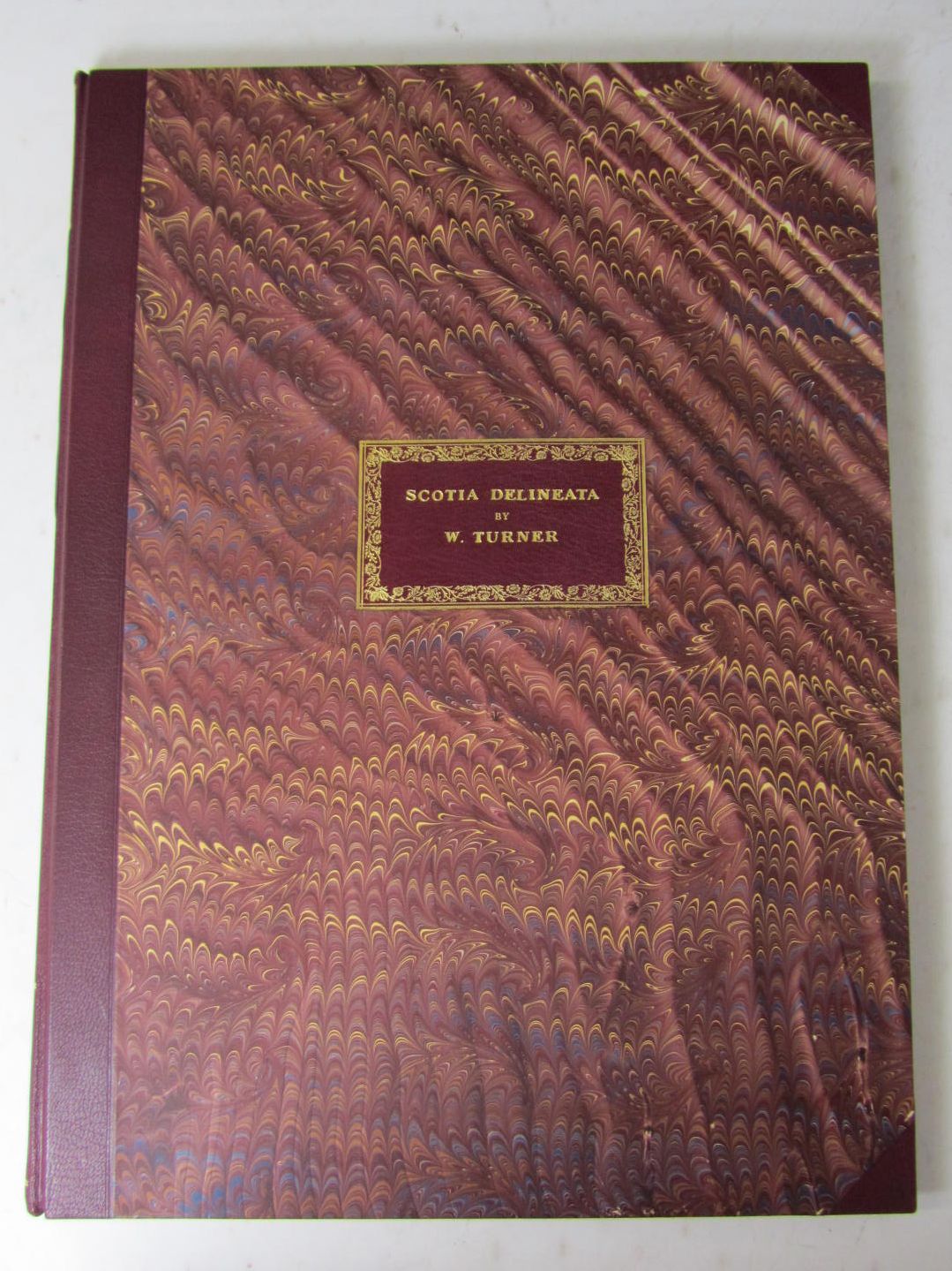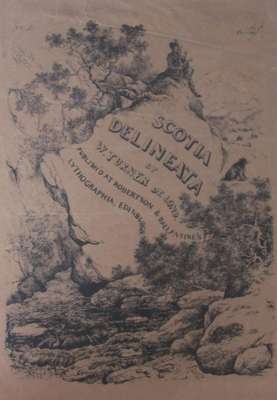 Scotia delineata. Edinburgh: Robertson and Ballantine's Lythographa, 1824. Large folio, lithographed pictorial title on original upper cover with double tint stamp applied twice and five plates printed in two colours and finished by hand, each with page of letterpress description, modern burgundy half morocco gilt with marbled boards