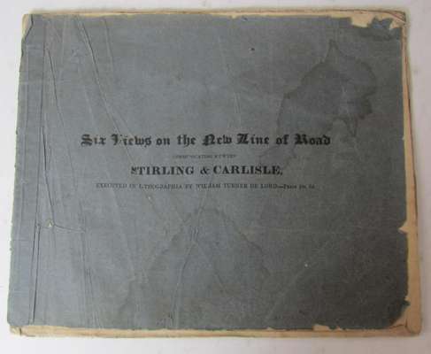 Six views on the new line of road communicating between Stirling and Carlisle. Edinburgh: Nimmo, [watermark 1825]. Oblong folio, 6 lithographed plates, original blue paper wrappers with printed title, slight marginal dustsoiling and dampstaining, part of lower cover corners of upper wrapper torn away