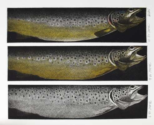 Some trout. Poetry on trout and angling by various authors. Chevington Press, [1997]. Large folio, 13 coloured prints, signed by artist, original half morocco with marbled boards, slipcase; together with uniform large folio of working proofs (2)