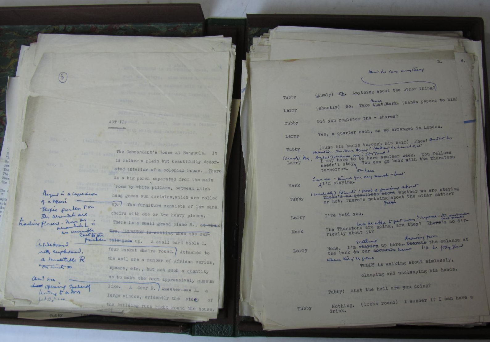 Autograph manuscript notebook, a 'Rough out' and extended draft (Act I and part of Act II) of an unidentified play, 37 pages, 4to, boards; with typescripts with autograph emendations and insertions of the plays The Case of the Frightened Lady (1931, lacking end of Act III), and The Green Pack (1932, Acts II and III only), together 8 pages, 4to, wholly in autograph, and approximately 160 pages, 4to, corrected typescript; a further typescript with emendations in another hand of The Green Pack, and typed comments on a production of a play, together 139 pages, 4to, folding box