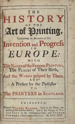 The history of the art of printing, containing an account of it's invention and progress in Europe. Edinburgh: Printed by James Watson, 1713. First edition, 8vo, [24, xlviii; 64], folding woodcut plate, typographical specimens in text, title printed in red and black, blue morocco gilt by H. Faulkner, George Court, Adelphi, with his ticket, blindstamped roll border and gilt fillet to sides, g.e., Strathallan bookplate, tear to folding plate repaired without loss