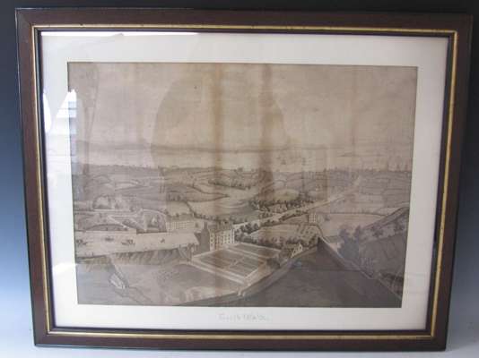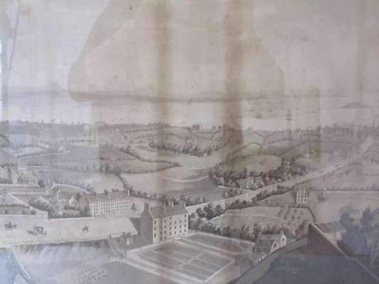 Late 18th century Scottish School etching of Leith walk, framed and glazed, 70x56cm including frame, shows a perspective of the route down Leith Walk from the top of Calton Hill, the road being predominantly surrounded by fields with few houses, some slight spotting and darkening, also dustsoiling