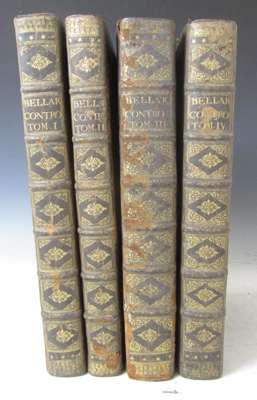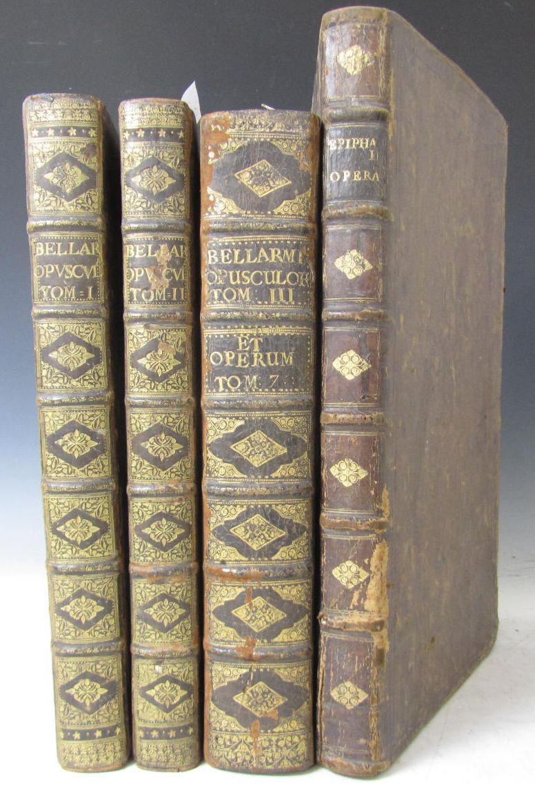 Disputationes... de controversiis Christianae fidei... Paris: Officina Tri-adelphorum, 1613. Folio, 4 volumes, vignette titles in red and black, worming to upper right corner of volume I, title of volume III & IV with small waterstain, contemporary speckled calf gilt, sections of backstrips worn; Bellarmino, Roberto Operum. Cologne: Bernard Gualther, 1617. Volumes 5-7, contemporary calf gilt lettered on spines Tome I-III, slightly rubbed, staining and foxing to some pages of volume 7; Epiphanius, Saint. Opera. Cologne, 1617. Folio, contemporary calf, spine gilt, rubbing and very slight worming to covers, spine slightly cracked, some pages creased and slightly damaged, occasional foxing (8)