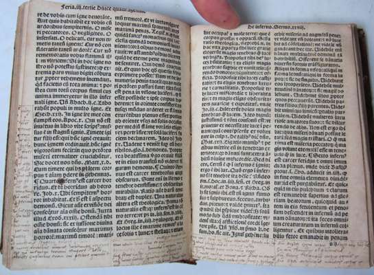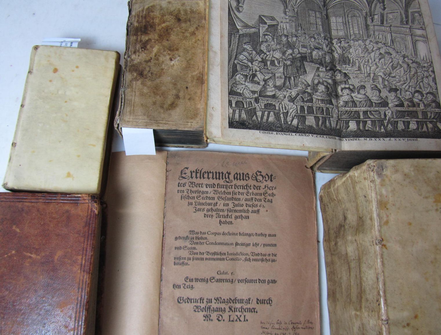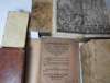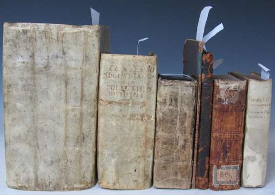Glaubens Trost aus den Göttlichen wolthaten und schassen. Frankfurt am Main: J.D. Zunners, 1695. 4to, title printed in red and black, contemporary vellum, [Aquilanus, Johannes]. [Sermones Quadragesimales venerabili viri fratris Johannis Aquilani Ordinis predicatorum de observantia merito vitiorum luna nuncupati.] Lyon: Franciscus Fradin, 1501. 8vo, black letter, double column, contemporary calf, early inscription of Conventus Montis Sancti, text before B2 supplied in early pen manuscript, some worming affecting text at end, some headlines cropped, head of spine very wormed; [Lutheran Church] Concordia pia et unanimi consensu repetita confessio fidei et doctrinae. Leipzig: offiicina Grossiana, 1742. 8vo, 3 parts in one volume, double-page engraved frontispiece, contemporary vellum; [Moerlin, Joachim] Erklerung aus Gottes Woort. Magdeburg: Wolffgang Kirchener, 1561. 4to, wrappers, slightly browned; Hobbes, Thomas Elementa philosophica de cive. [No place] : apud Joh. Frid. Zeidlerum, [1705]. 12mo, engraved title, contemporary vellum, [Macdonald & Hargreaves 31]; Erasmus, Desiderius Adagiorum epitome. Amsterdam: Ludovic Elzevir, 1650. 12mo, contemporary vellum, occasional slight marginal staining, binding worn; Bromley, Thomas Der Weg zum Sabbath der Ruhe. Frankfurt and Leipzig: J.F. Regelin, 1731. 8vo, frontispiece, contemporary half calf, slight dampstaining, rubbed (7)