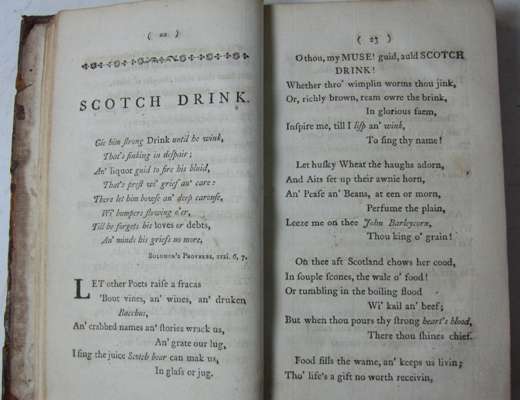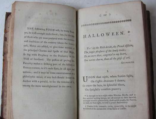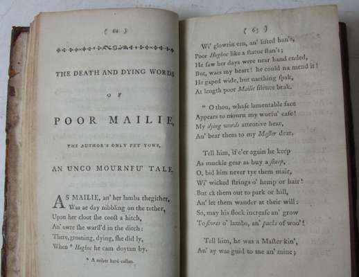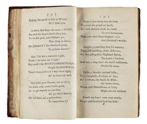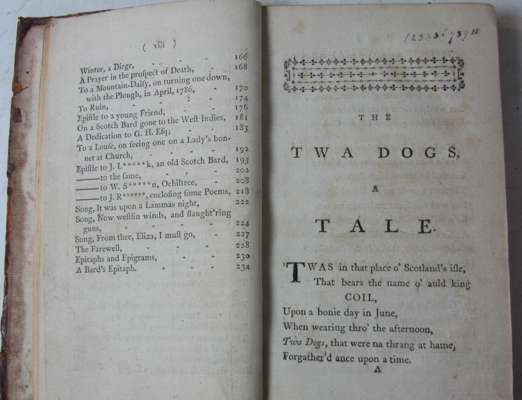 Poems, chiefly in the Scottish dialect. Kilmarnock: John Wilson, 1786. First edition, 8vo, (195 x 110mm.), title, a2-3 and X4-Ff4 (i.e. pp. [i]-vi and 175-240) supplied in facsimile, contemporary calf, spine gilt, slightly spotted, tear to C4, G4 and P2 repaired without loss, repair to fore-margin of C3 with loss of a few letters, tear to K2 repaired affecting a few letters, lower margin of Q1 restored, very small repair to head of U3, tiny hole affecting bracket symbol to right of page numeral, marginal tear to F1, F4, G4 neatly repaired, T4 washed, ink numerals 1-10 at head of p.9, rubbed, rebacked, corners repaired