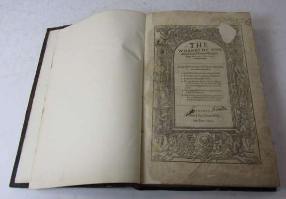 The works of our ancient and learned poet, Geoffrey Chaucer. London: Adam Islip, 1602. Folio, rebacked calf, title page repaired, some foxing, and slight damp- and dust-staining, Lacks the portrait of Chaucer and the initial blank leaf, scattered spotting throughout, dampstaining to most upper corners/upper margins, some soiling and marking, title extensively repaired in inner and lower margin, and with large hole top right affecting woodcut image, 23 leaves towards beginning with worming in lower margin repaired occasionally affecting a catchword,