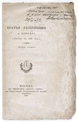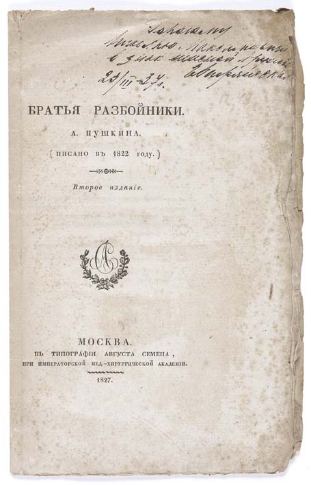 Brat'ya razboiniki... vtoroe izsanie [Robber brothers... second edition]. Moscow: Avgust Semen, 1827. 8vo, 12pp., printer's device on title-page, loose, without printed wrappers, slightly foxed