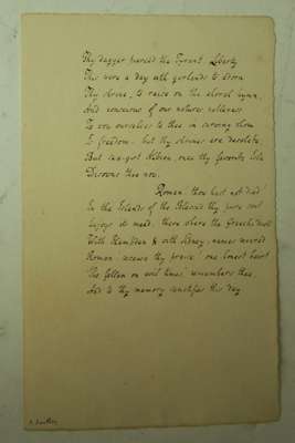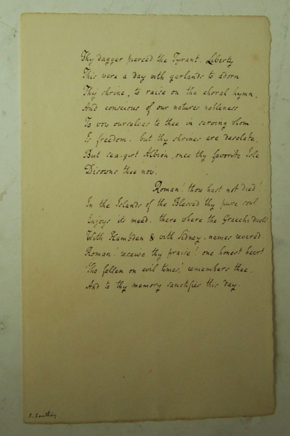 Autograph poetical manuscript, 'The Ides of March. March 15', from line 27 ("Thy dagger pierced the Tyrant. Liberty") to the end of the poem, [c.1798], 1 page, 8vo, the author's name added in another hand