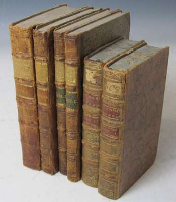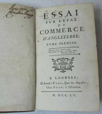 Essai sur l'etat du commerce d'Angleterre (translated and augmented by Georges-Marie Butel-Dumont). London and Paris: Nyon, 1755. 12mo., 2 volumes, a few woodcut initials, head- and tailpieces, contemporary mottled calf with marbled edges, spine gilt in compartments with red morocco lettering-pieces, [Goldsmiths 9015; Kress 5424], extremities slightly rubbed, both upper joints cracking at head; [Butel-Dumont, Georges-Marie] Théorie du luxe ou traité dans lequel on entreprend d'établir que le luxe est un ressort non-seulement utile, mais même indispensiblement nécessaire á la prosperité des états. 1771. 8vo., 2 volumes, half-titles, errata leaf at end of volume 2, contemporary half calf, monogram stamped on upper covers, [Goldsmiths 10707]; [Oudermeulen, F. van der] Recherches sur le commerce, ou idées relatives aux intérêts des différens peuples de l'Europe. Amsterdam: Marc Michel Rey, 1778-1784. 8vo., 3 parts (of 4) in 2 volumes, half-titles, 7 engraved plates (some folding), 6 folding printed tables, contemporary half calf, [Goldsmiths 11748; Kress B137], lacking volume 2, part 2 (6)