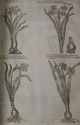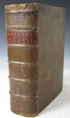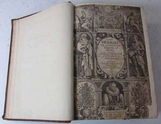 The herball or generall historie of plantes. London: Norton & Whitakers, 1636. Folio, engraved frontispiece, 18th century calf, some cracking to joints and bumping to spine, margins of several pages repaired, some minor spotting, some dampstaining and slight soiling