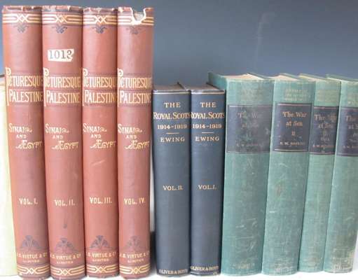 Picturesque Palestine, Sinai and Egypt. London: Virtue, [c.1880]. 4 volumes, 4to, original cloth, one volume chipped; Ewing, John The Royal Scots 1914-1919. 1925. 2 volumes, 8vo, plates, original cloth, t.e.g.; Roskill, Capt. S.W. The war at sea 1939-1945. 1954-61. 3 volumes in 4, 8vo, maps, plates, original cloth; Marder, A.J. From the Dreadnought to Scapa Flow. London, 1961-70. 5 volumes, 8vo, plates, original cloth, dust-jackets faded; Marder, A.J., Editor Fear God and dread nought. London, 1952-1959. 3 volumes, 8vo, original cloth; Philby, H. St. J. Sheba's daughters. 1939. 8vo, plates, original cloth, spine faded; and a small quantity of miscellaneous books (quantity)
