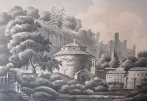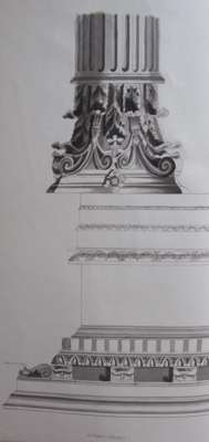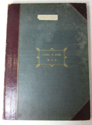 30 watercolours, many with coloured tints, with tissue guards on leaves c.250x360 mm and 4 studies of the Orders of Architecture, one signed "M.F., 1827", 14 of the watercolours accompanied by folios with neat manuscript explanations, ca.1820-1830, bound together in contemporary half morocco folio album, with gilt title on upper cover reading, "Views in Rome, M. F. Sr.", and small paper label, some rubbing and soiling to covers and spine and slight internal spotting