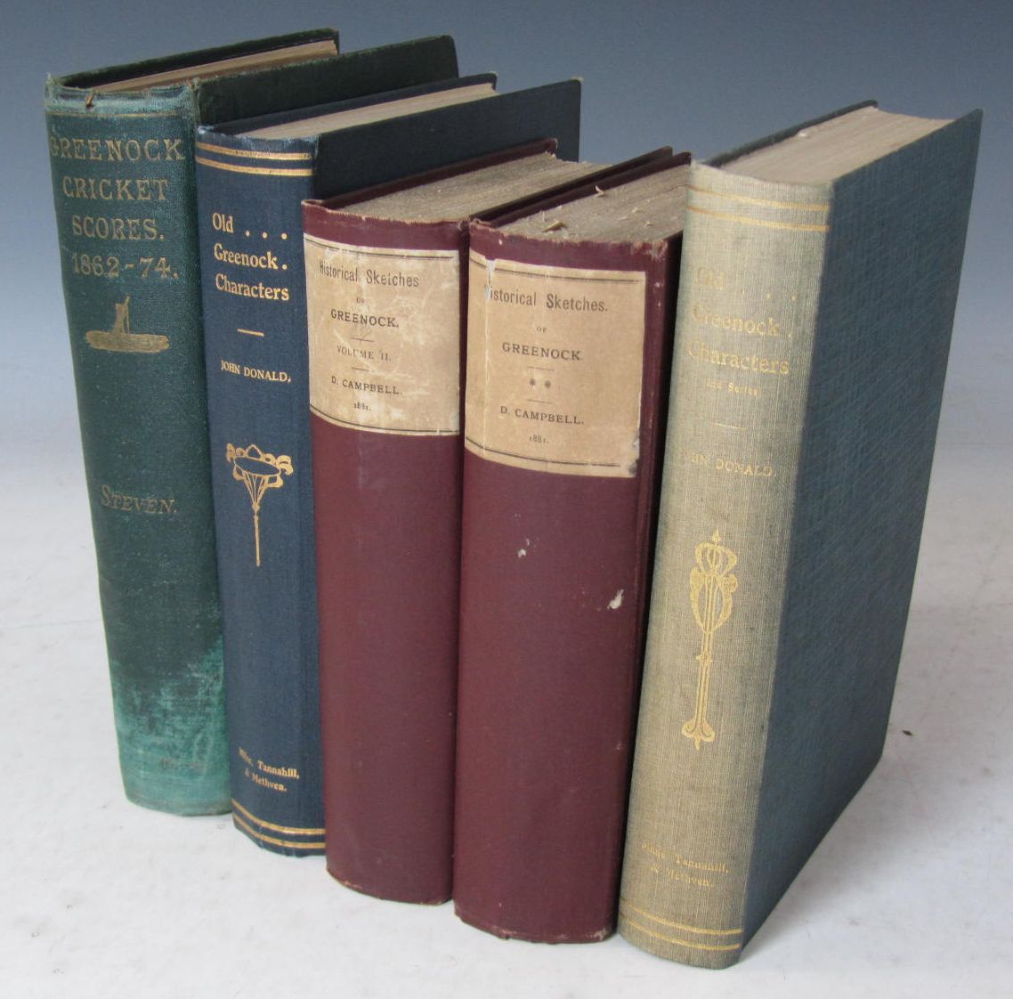 Sketches of Greenock and its Harbours in 1886. Greenock:1886. 4to, 43 plates, original cloth gilt, some shallow scratches to covers; Campbell, Dugald Historical Sketches of Greenock. Greenock: Orr, Pollock & Co., 1881. 2 volumes, 8vo., signed by the author, original cloth, hinges splitting; Donald, John Old Greenock Characters. Perth: Milne, Tannahill & Methven, 1930. 8vo, fading to spine, dedication and signature by author; Lear, Edward. The Book of Nonsense to which is added More Nonsense with all the Original Pictures and Verses. London: Frederick Warne & Co., [1913?] Original dust jacket, slight foxing; Davey, Doris. My Dolly's Home. London: Arts and General Publishers Ltd., [1921?]. Includes 5 paper dolls, one missing head, which can be placed within home and garden scenes in book, occasional tears to moving components, some foxing and wear to covers; and 24 others, including children's books and works on Greenock (29)