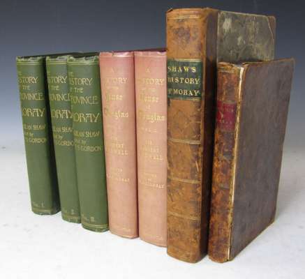 Shaw, Lachlan The history of the Province of Moray. Glasgow: Thomas D. Morison, 1882. 8vo.,. 3 volumes, original green cloth gilt, slight bumping to spines and corners, minor soiling to covers, some darkening to endpapers; [Idem] The history of the Province of Moray. Elgin: printed for J. Grant, 1827. 4to., 14 plates, lacking map, contemporary half calf with some rubbing to spine and boards, foxing, mostly marginal; Maxwell, Herbert, Sir A history of the house of Douglas. London: Freemantle & Co., 1902. 8vo., 2 portraits, 1coloured, 12 coloured plates of coats of arms and other plates and illustrations, original red cloth gilt, some fading to spines, very occasional spotting, marginal tear to page 169, with no loss of text; [Grant, John] A survey of the Province of Moray... Aberdeen: printed for Isaac Forsyth, 1798. 8vo., hand coloured folding map with a few closed tears, contemporary calf, joints cracked, spine and boards rubbed and chipped (7)