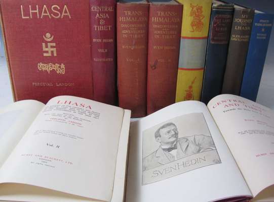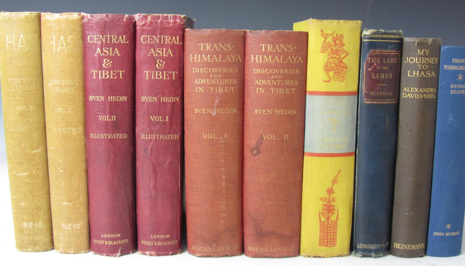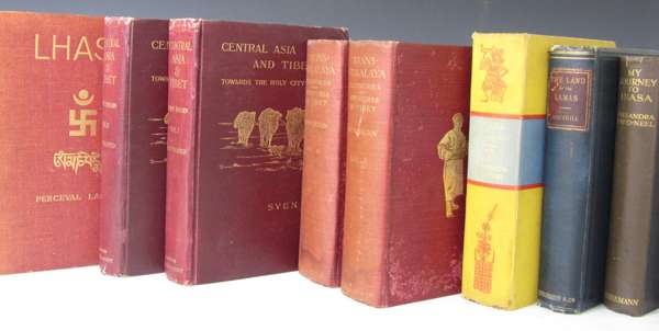 Lhasa, an account of the country and people. London: Hurst & Blackett, 1905. First edition, 2 volumes, 8vo, 7 maps, 254 plates & illustrations, original red buckram gilt, t.e.g., spines faded; Hedin, Sven Central Asia and Tibet. Towards the Holy City of Lhasa. London: Hurst & Blackett, 1903. 2 volumes, 8vo, 4 folding maps, 8 colour plates, 387 photographic illustrations, original pictorial cloth gilt, t.e.g., lightly rubbed; Hedin, Sven Trans-Himalaya. Discoveries and adventures in Tibet. London: Macmillan, 1909. 2 volumes, 8vo, [without the supplementary volume published in 1913], "Presentation copy" blindstamp to titles, 10 maps, 388 illustrations, original pictorial cloth, covers slightly marked; Rockhill, William W. The land of the lamas. Notes of a journey through China, Mongolia and Tibet. London: Longmans, Green & Co., 1891. 8vo, frontispiece, 2 maps, illustrations, original cloth, lightly rubbed; Chapman, F. Spencer Lhasa the Holy City. London: Chatto & Windus, 1938. First edition, 8vo, plates, some coloured, maps, original yellow cloth, slightly marked; David-Neel, Alexandra My journey to Lhasa. London: W. Heinemann, 1927. First English edition, 8vo, plates, original pictorial cloth gilt, slightly rubbed; Seaver, George Francis Younghusband. London, 1952. 8vo, original cloth (10)