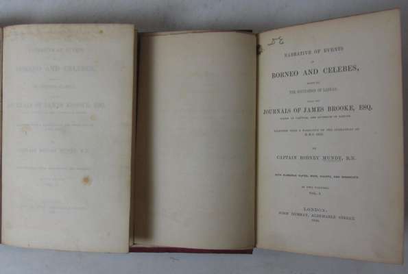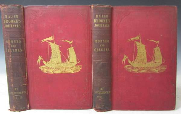 Narrative of events in Borneo and Celebes. London: John Murray, 1848. 2 volumes, 8vo, engraved portrait, 5 folding charts and 17 plates, original red pictorial cloth, some spotting, library blindstamps, small stain to volume 1 title, small strip of foremargin of p.ix/x vol. 2 torn away, worn