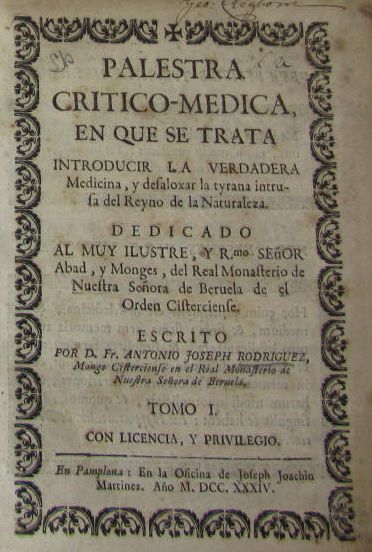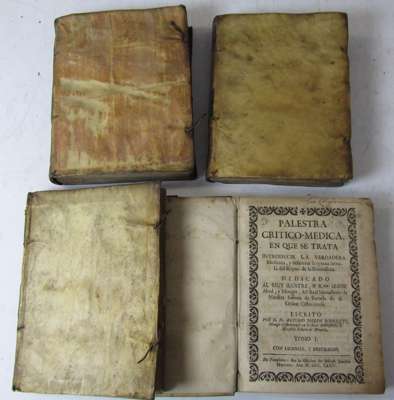 Palestra critico-medica. Pamplona: J.J. Martinez, 1738- Zaragoza: F. Moreno, 1741. 4 volumes, 4to, contemporary vellum, some spotting and browning, D1 and D4 volume 4 torn without loss, bindings soiled, library stamps (4)