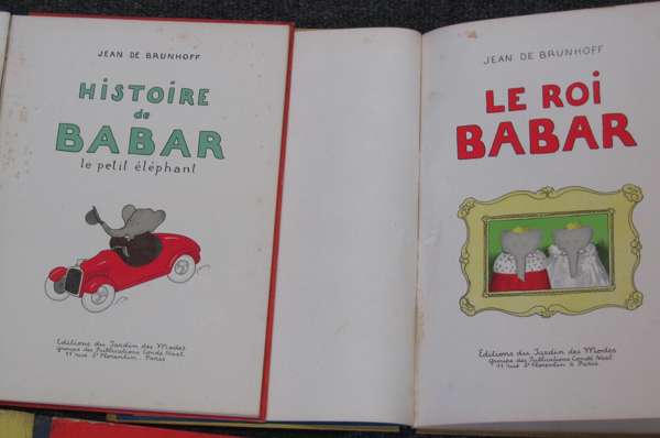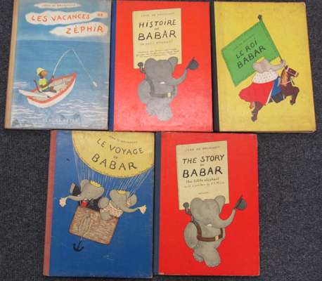 Histoire de Babar. Paris, [1931], First edition, slight spotting, a few lower margins slightly wormed at end, upper hinge broken; Le voyage de Babar. [1932, listing 3 titles on title verso]; Le roi Babar, [1933, listing 2 titles on title verso]; Les vacances de Babar. [1936]; The story of Babar. 1937. Third English edition, original cloth-backed pictorial boards, all with some spotting and soiling, boards somewhat soiled and slightly rubbed (5)