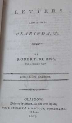 Note: Publisehd without the permission of Mrs M'Lehose (Clarinda). Two friends had approached her on behalf of Mr Finlay who was at that time engaged on a Life of Burns to make a few extracts from the letters for his projected work; unfortunately Finlay allowed Stewart the Glasgow bookseller to publish the whole letters but an interdict was granted to Cadell & Davies, the London publishers, and this edition was suppressed.