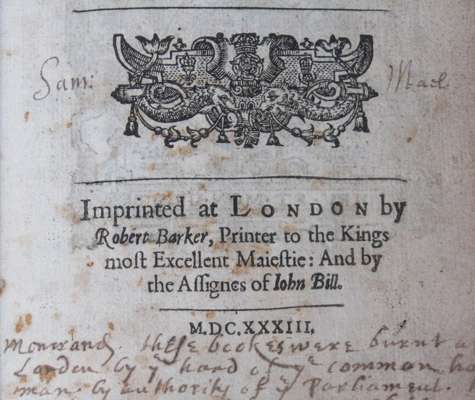 Note: At the foot of the title is a note "these bookes were burnt at London by ye hand of ye common ha[ng]man, by authority of ye Parliament [?] 1641" In the work activities allowed, after the end of divine service, include "dancing, either men or women, archery for men, leaping, vaulting, or any such harmless recreation, May-Games, Whitson Ales and Morris Dances, and the setting up of Maypoles" while still probibited are "Beare and Bullbaitings and at all times in the meaner sort of people... bowling."