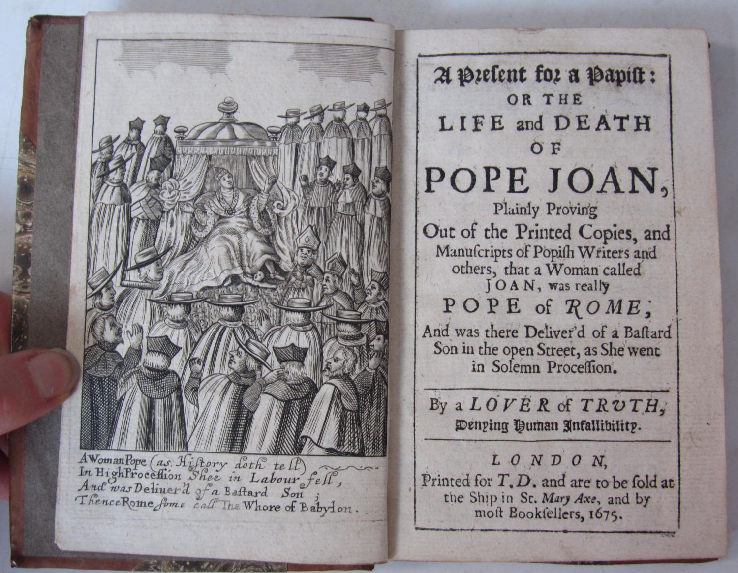 A present for a papist. Or the life and death of Pope Joan, plainly proving... that a woman called Joan, was really Pope of Rome... London: T.D., 1675. 8vo., engraved frontispiece, half calf rebacked, marbled boards, [Wing (2) C5996B]