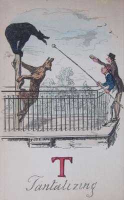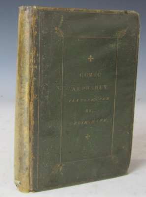 A comic alphabet. Pentonville: published by the author, 1837. 12mo.,engraved title on yellow background, 24 hand-coloured plates, other hand-coloured illustrations, original yellow engraved wrappers bound in, contemporary green morocco gilt, rubbed, hinges broken, held together by clear cellophane wrapper, some pages loose, coloured title darkened