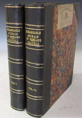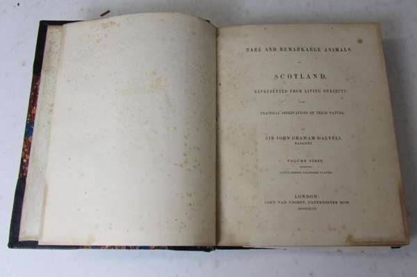 Rare and remarkable animals of Scotland. London: John van Vroost, 1847. 4to., 2 volumes, 110 hand coloured plates, occasional foxing, sometimes to plates, foxing to endpapers, Ex Libris bookplate reading: "Norfolk & Norwich Library... This book is part of the salvage from fire which occured on August 1st, 1898", modern half morocco, spines gilt, library plates attached neatly to covers (2)