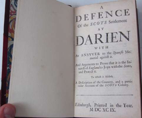A defence of the Scots settlement at Darien... a descripton of the country, and a particular account of the Scots colony. Edinburgh: printed in the year 1699. First edition, 12mo, [4], 57, maroon half morocco gilt, g.e., [Wing F2047A]