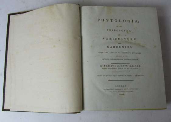 Phytologia, or the philosophy of agriculture and gardening. London: printed by J. Johnson by T. Bensley, 1800. First edition, 4to., 12 engraved plates, two folding, contemporary tree calf, some rubbing and cracking to spine, slight rubbing to covers, occasional foxing, sometimes to plates, occasional offsetting onto text