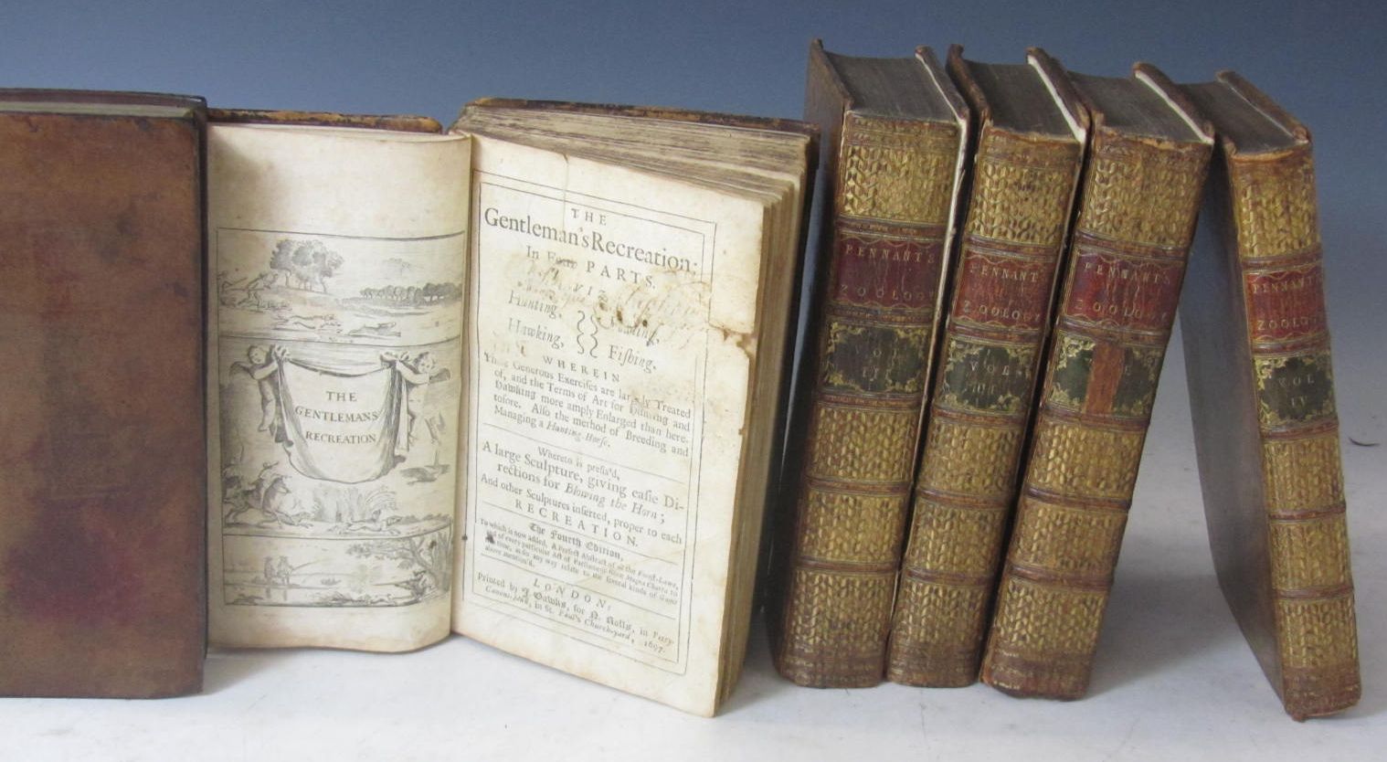 The gentleman's recreation... fourth edition. London: J. Dawks for N. Rolls, 1697. 8vo, engraved frontispiece and 4 folding plates, the large folding plate trimmed at fore-edge, torn and laid down on linen, ownership inscription on title deleted resulting in small holes, contemporary calf, [Wing C6907], spotting, rubbed, cover detached; Pennant, Thomas British zoology. Warrington: B. White, 1776, Fourth edition, 4 volumes, 8vo, 3 engraved titles, folding plate of music and 186 plates (as per lists of plates), contemporary tree calf, rubbed, two covers detached; and Kennet's Rome (6)
