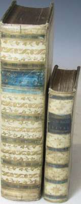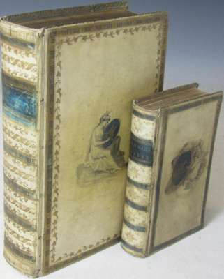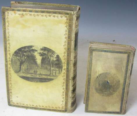 Oxford: S. Crowder & W. Jackson, 1772. 8vo, engraved plates; Book of Common Prayer Oxford: S. Crowder & W. Jackson, 1772. 12mo, both contemporary vellum gilt with image on covers, blue painted border and spine divisions, flat spines gilt, g.e., Bible with small split at head of spine, slightly marked, image on lower cover of Common Prayer obscured (2)