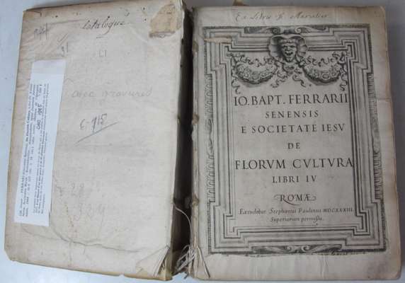 De florum cultura libri IV. Rome: Stephanus Paulinus, 1633. First edition, 4to (240 x 170mm.) engraved title, engraved additional title, 7 full-page engraved illustrations of parterres, 38 full-page engraved illustrations of flowers, tools and allegorical subjects, old vellum, title cut round and mounted, some spotting, browning and dampstaining, hinges broken