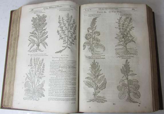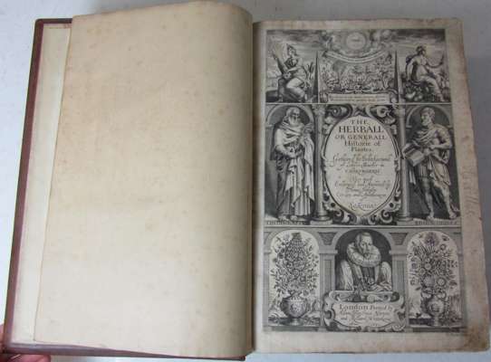 The herball or generall historie of plantes. London: Hip, Norton and Whitakers, 1633. Second edition, folio, woodcuts, bookplate of Horace Somerville Sewell, later embossed and panelled calf, spine gilt, a couple of closed repairs to pages 39, 915 and 916 with text and engravings slightly impaired, repairs to lower corners of page 1563 to end with loss of a few letters/words of index pages, final 8 leaves lacking, a little spotting, some dust-soiling and slight chipping to some page-edges, spine a little faded, slight wear to hinges [ESTC S122165; STC 11751]